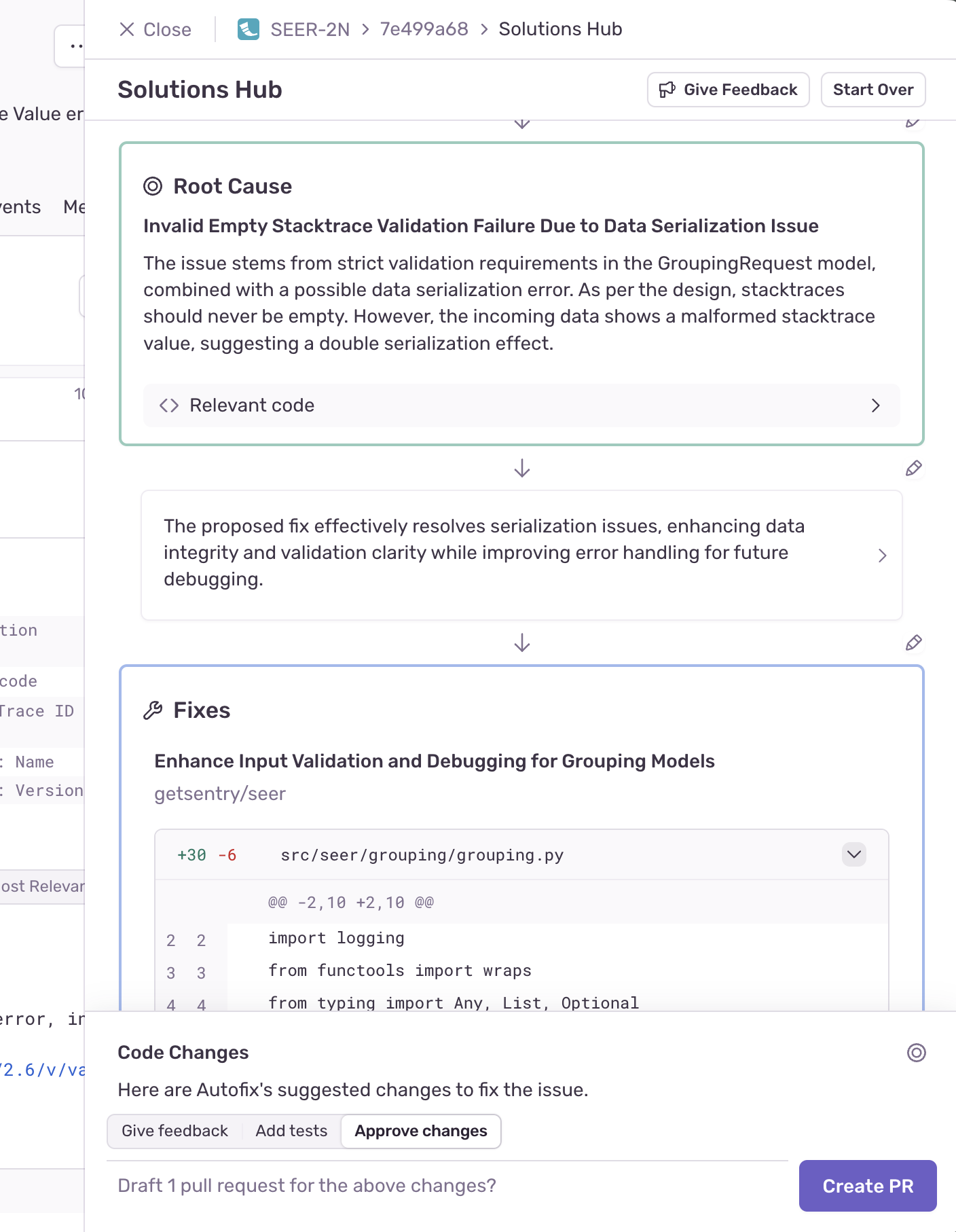When you’ve identified the root cause, or gathered enough information to propose your own solution, Autofix will use the same process to suggest a fix. It will present a diff of the proposed code changes. You can then: